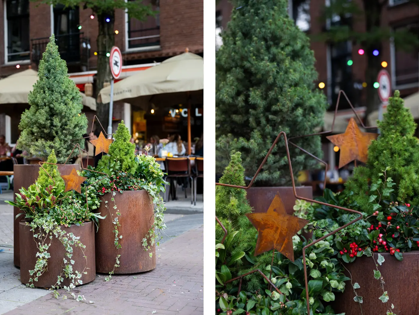 De kerstdecoraties van Upperbloom zijn afgestemd op de natuurlijke buitenomgeving en stralen eenvoud en elegantie uit. Met elementen zoals cortenstalen kerststerren, subtiele gouden cirkels en fonkelende lichtfonteinen, creëer je een magische ambiance die een warme, uitnodigende sfeer oproept.