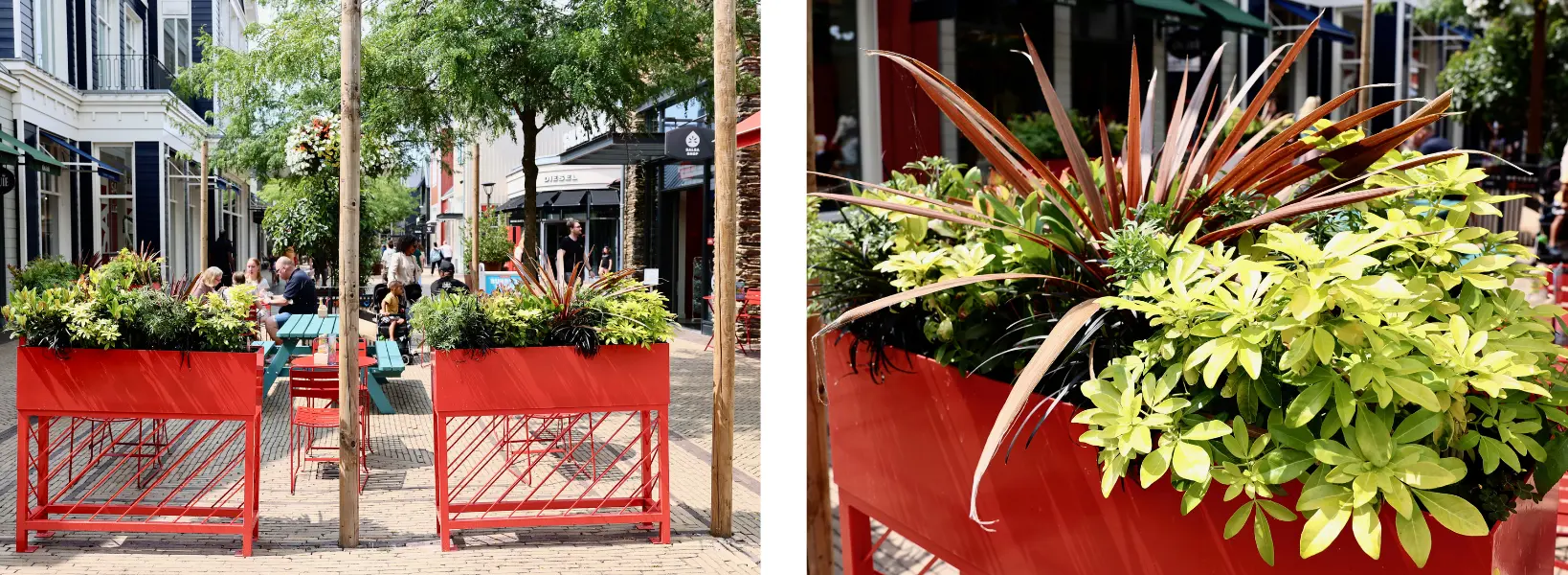 Upperbloom heeft een fris groen ontwerp gepresenteerd met een zorgvuldig samengestelde mix van planten in verschillende tinten groen. Deze keuze benadrukt het effect van variëteit in groen en creëert een prachtig contrast met de opvallende rode kleur van Salsa Shop. Het terrasontwerp maakt gebruik van plantenbakken met geïntegreerde waterreservoirs, wat zorgt voor een weelderige en gezonde uitstraling met minimaal onderhoud. Deze aanpak garandeert een aantrekkelijke en onderhoudsvriendelijke buitenruimte, die zowel visueel als functioneel perfect aansluit bij de uitstraling van Salsa Shop.