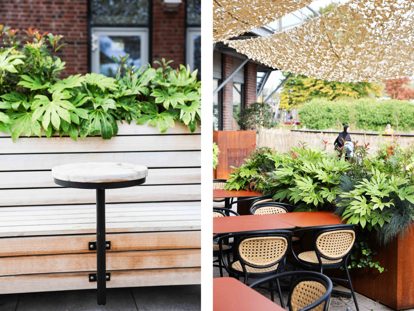 Het nieuwe terras, dat een open en gastvrije uitstraling heeft, is speciaal ontworpen voor de bezoekers van het Spoorwegmuseum. Dankzij de strategische opstelling van het groen is het terras een populaire plek geworden; bij elke zonnestraal verschijnt een stroom van gasten. Het groen zorgt niet alleen voor een warme sfeer, maar biedt ook meer privacy en comfort voor bezoekers, waardoor zij echt in het groen zitten.